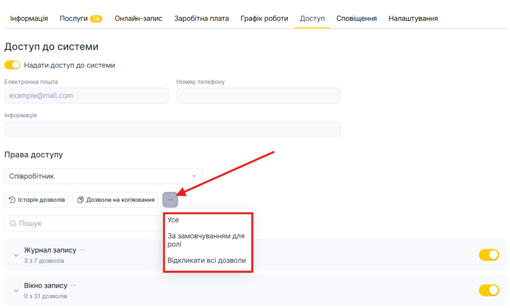 Увімкніть перемикач Надати доступ до системи, щоб співробітник міг входити у свій акаунт.