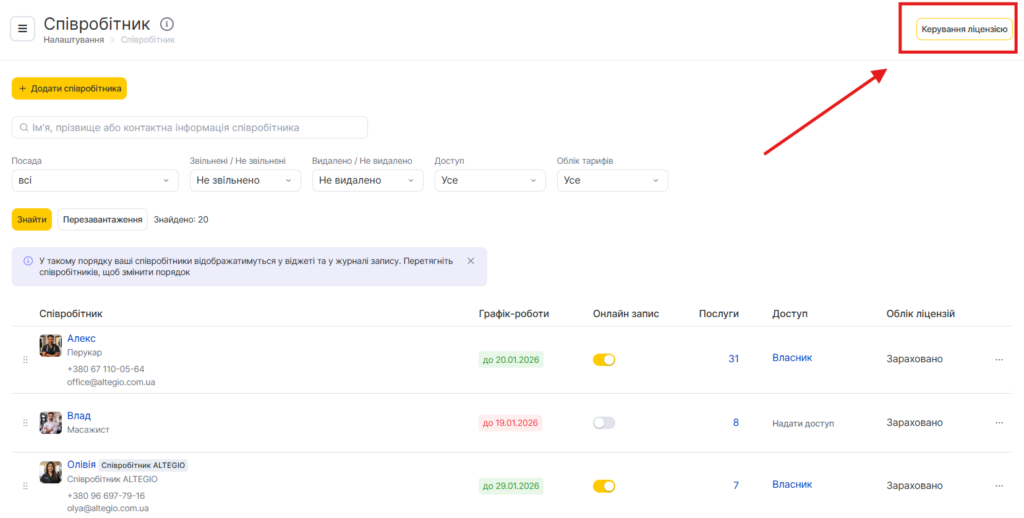 Якщо кількість співробітників у ліцензії обмежена, додавання нового співробітника може потребувати збільшення ліміту.