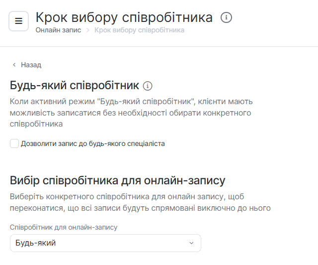 Увімкнення/вимкнення кнопки вибору будь-якого спеціаліста для всіх віджетів налаштовується в розділі Онлайн-запис > Налаштування > Крок вибору співробітника, параметр Дозволити запис до будь-якого спеціаліста.