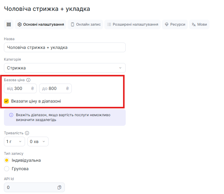 У разі, якщо в налаштуваннях послуги вказана базова ціна в діапазоні, для співробітників також можна вказати ціну в діапазоні. Це налаштування корисне, якщо ціна на послугу в одного й того самого співробітника може відрізнятися, наприклад, залежно від складності виконання.