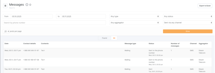 На цій сторінці відображається історія повідомлень, їхні статуси та інша інформація.