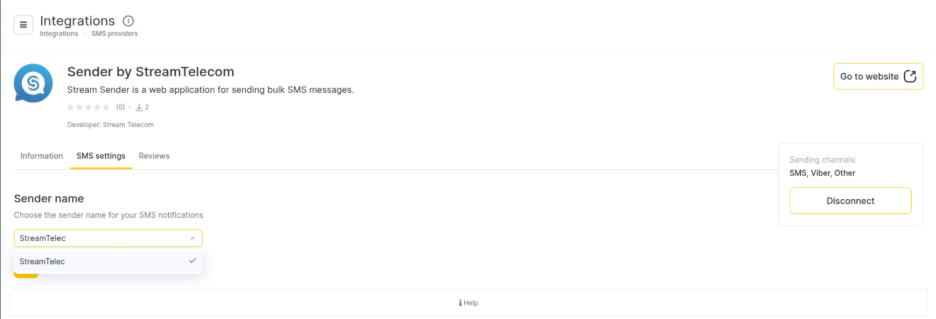 У Altegio поверніться до інтеграції Sender by StreamTelecom. Тут необхідно обрати Альфа ім’я для роботи сервісу та зберегти зміни.