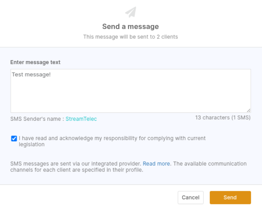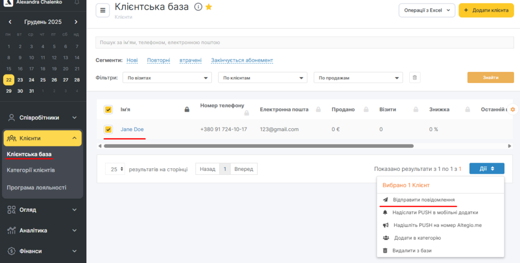 Оберіть клієнтів для розсилки та в правому нижньому куті натисніть Дії – Відправити повідомлення.