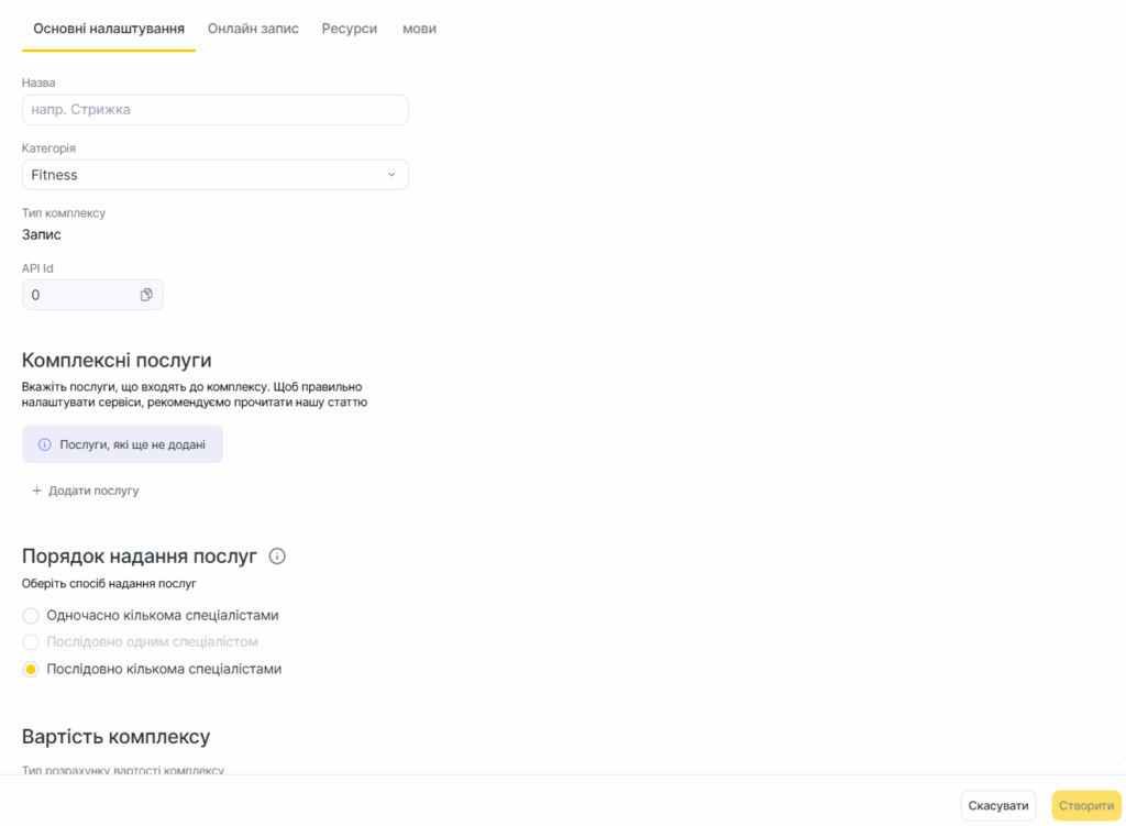 5. Відкриється форма створення та налаштувань. Вона схожа на стандартні налаштування послуги, але має додаткові параметри для комплексів. Заповніть дані та натисніть «Створити» (або «Зберегти» — для редагування). Створені комплекси позначаються значком «Комплекс» у списку послуг.
