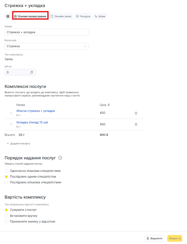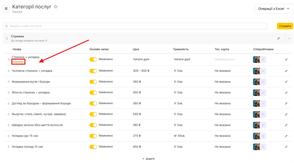 - Після заповнення даних натисніть кнопку Створити, а якщо редагуєте вже створений комплекс — Зберегти. Створені комплекси будуть позначені відповідним значком Комплекс у налаштуваннях послуг.