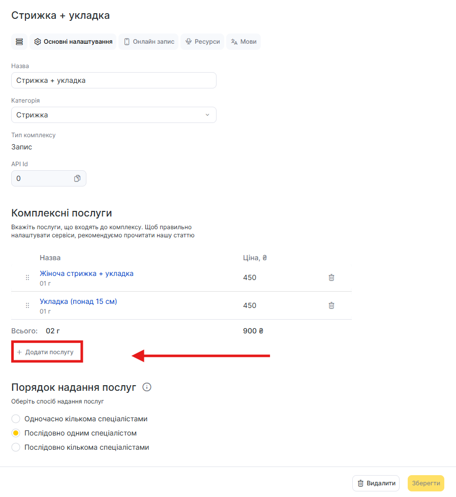 - У блоці «Порядок надання послуг» вибрати опцію «Послідовно одним спеціалістом», якщо всі послуги має виконувати один співробітник. Також можна вибрати «Послідовно кількома спеціалістами», якщо співробітники можуть бути різні.