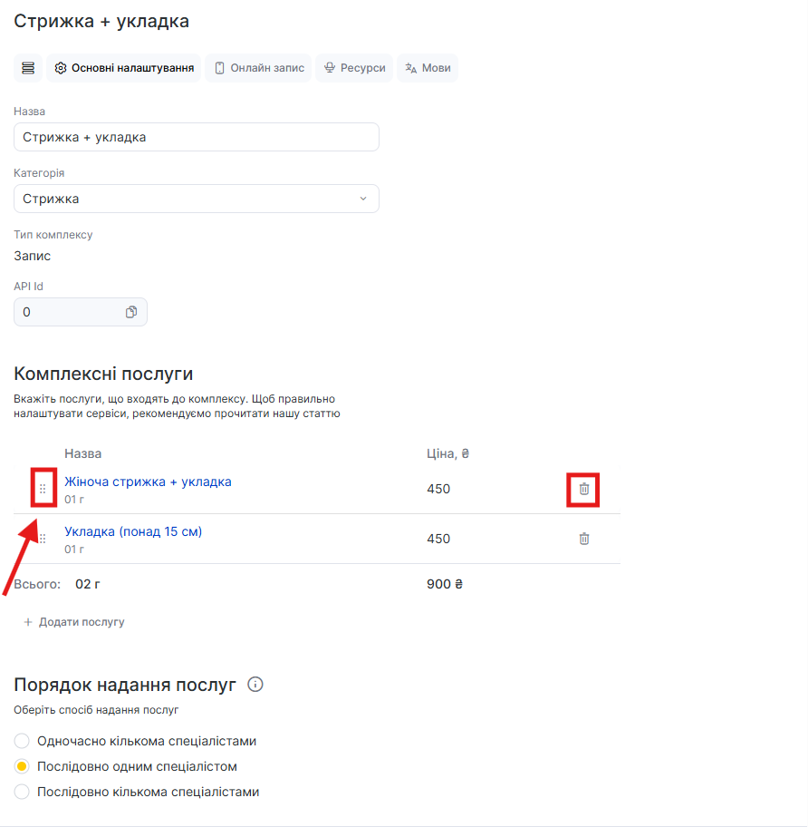- Якщо до запису комплексу була додана додаткова звичайна послуга, то її видаляють просто через значок кошика.