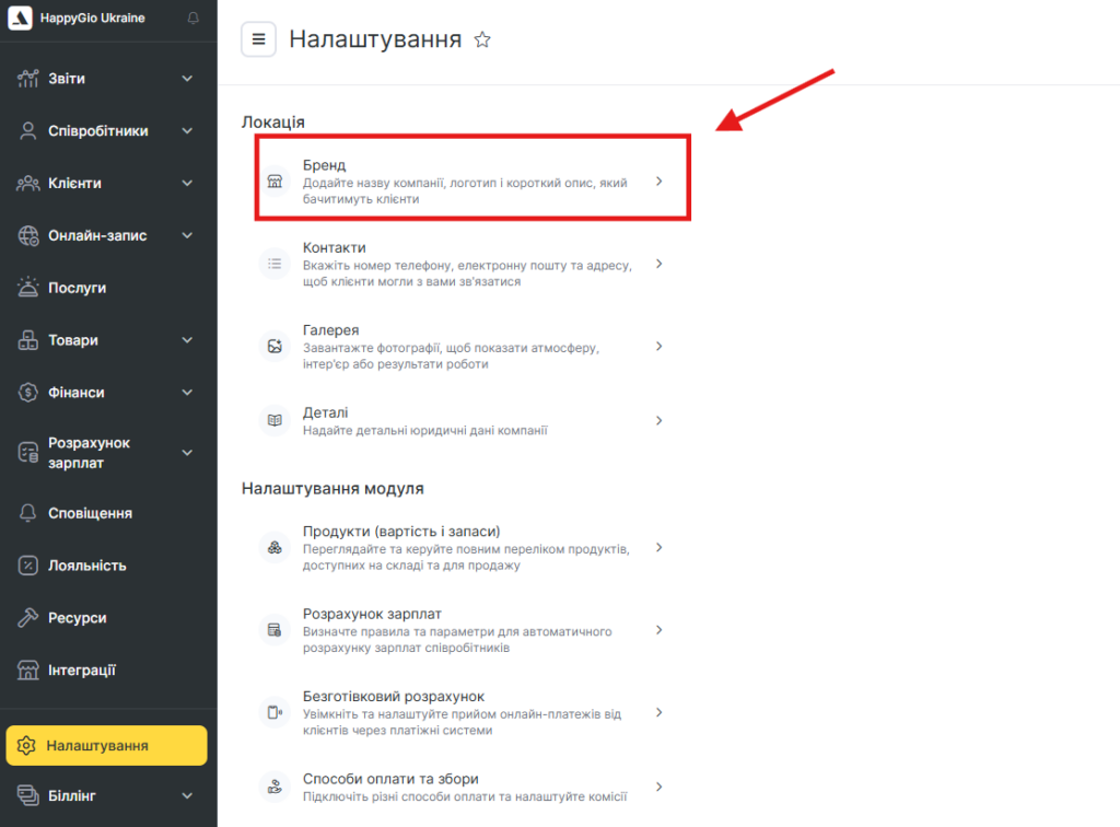 - Перейдіть у головному меню до розділу Налаштування > Локація > Налаштування філії.