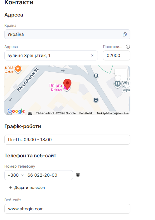 Контактні дані відображаються у віджеті онлайн-запису, на сторінці Про компанію та у списку філій. Розміщуються на зовнішніх ресурсах, таких як Google Maps.
