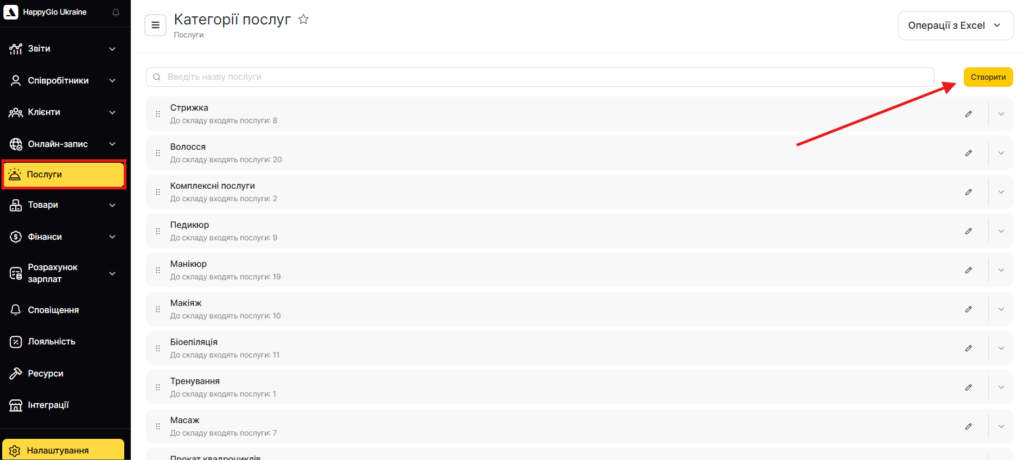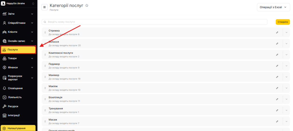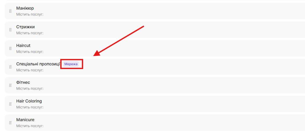 У розділі Налаштування > Налаштування запису > Послуги доступний список усіх категорій із послугами.
