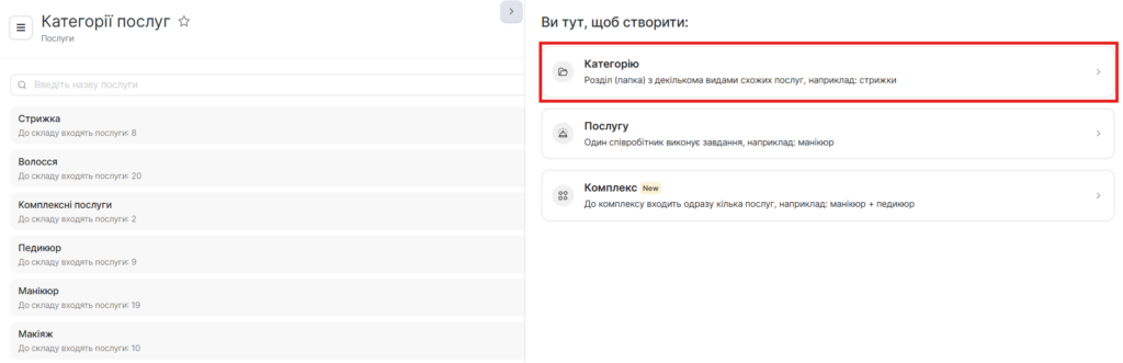 Приклади категорій: стрижки, фарбування, консультації, квести, кузовний ремонт.