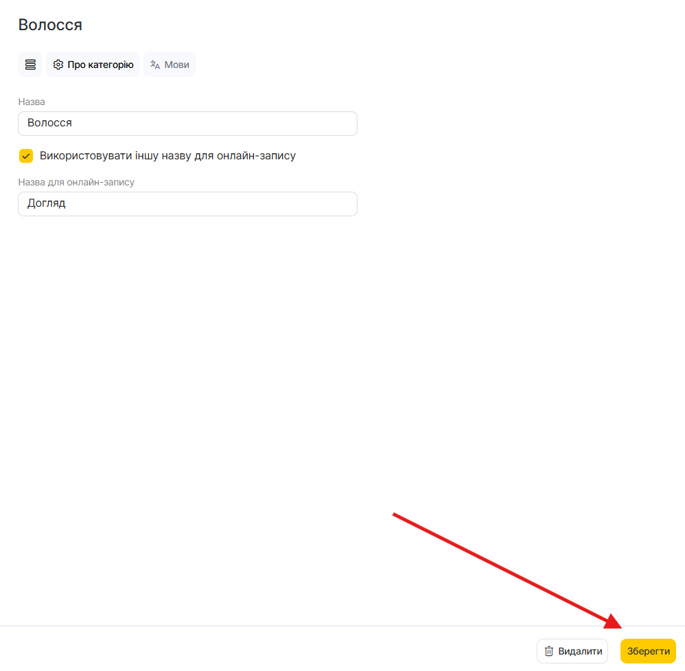 - У полі Назва для онлайн-запису вкажіть назву категорії, яку бачитимуть клієнти під час онлайн-запису.