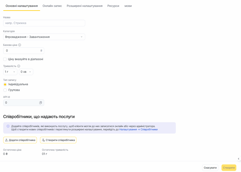 Цих налаштувань достатньо, щоб створити послугу, але для повноцінної роботи в програмі та онлайн-запису необхідні й інші налаштування.