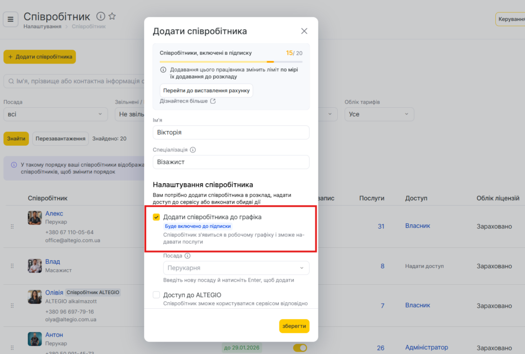 Після заповнення розділу «Послуги» додайте та відредагуйте інформацію про співробітників вашої компанії.