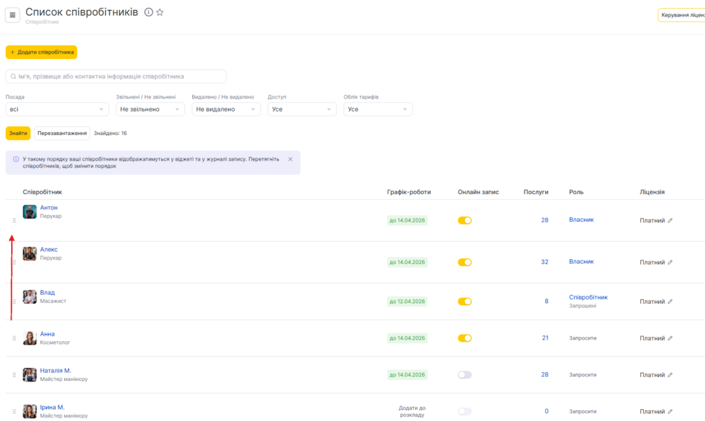 Співробітників можна змінювати місцями у списку, перетягуючи рядки за іконку сортування зліва. Цей порядок відображається у журналі записів та у віджеті онлайн-запису.
