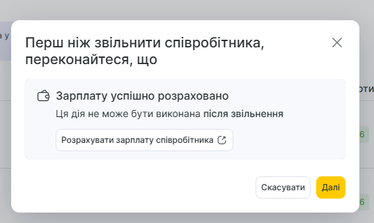 Щоб уникнути неприємних ситуацій, які можуть виникнути після звільнення або видалення співробітника з філії, наприклад коли співробітника вже звільнили, але його записи не перенесли або йому не нарахували заробітну плату, ознайомтеся з інформацією нижче.