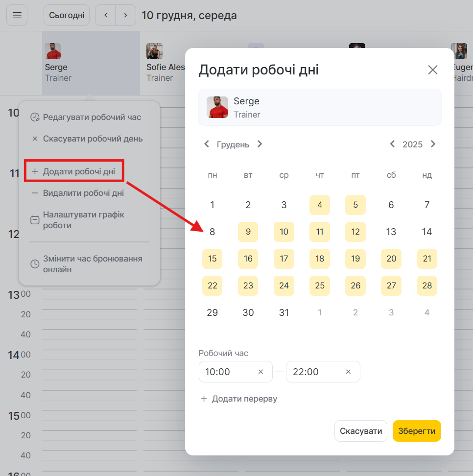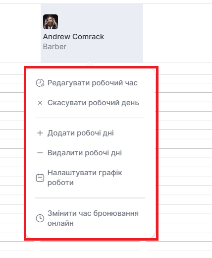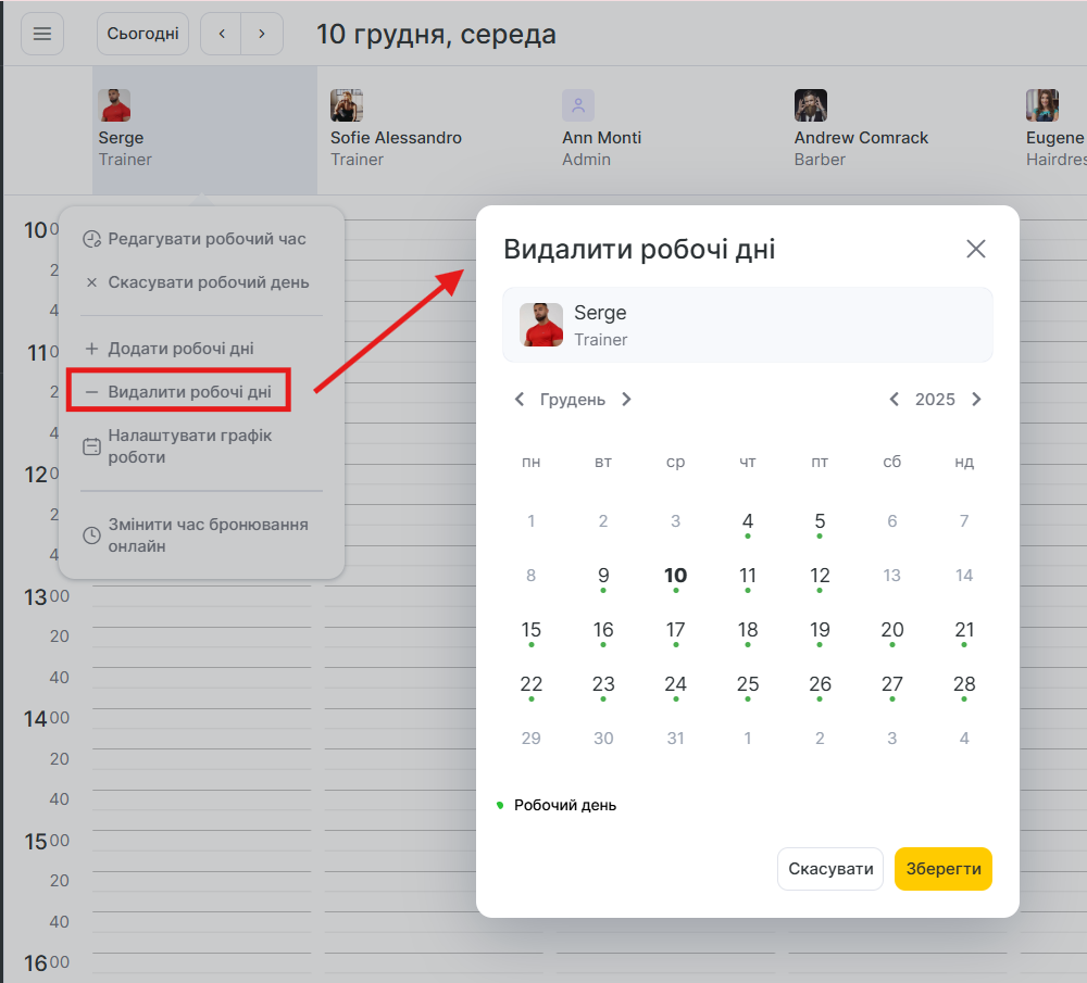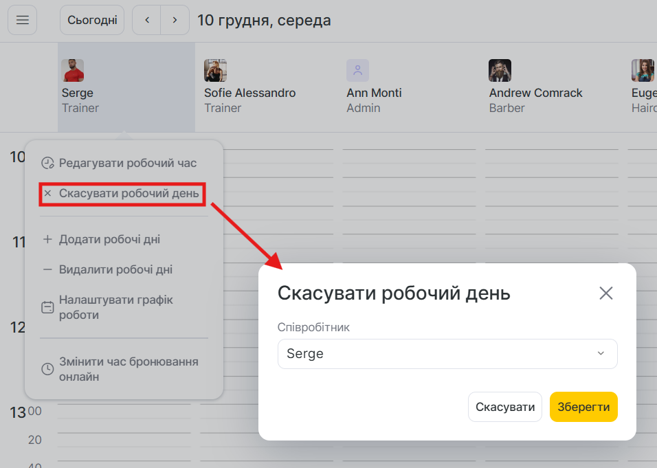 Якщо на вибрану дату співробітника є записи, і ви не перенесете або не скасуйте їх, знову додайте робочий день, і записи з’являться в розкладі співробітника. Перенесіть або скасуйте їх, а потім знову скасуйте робочий день.