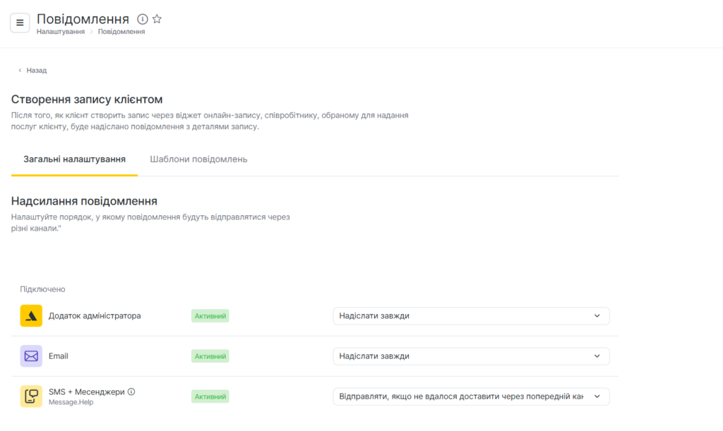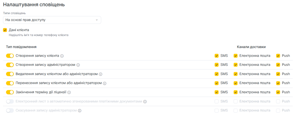 Щоб сповіщення надсилалися через канали SMS, Email або Push, відповідні типи сповіщень мають бути попередньо налаштовані.