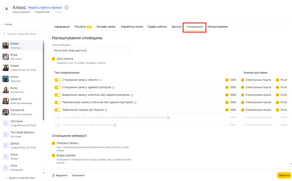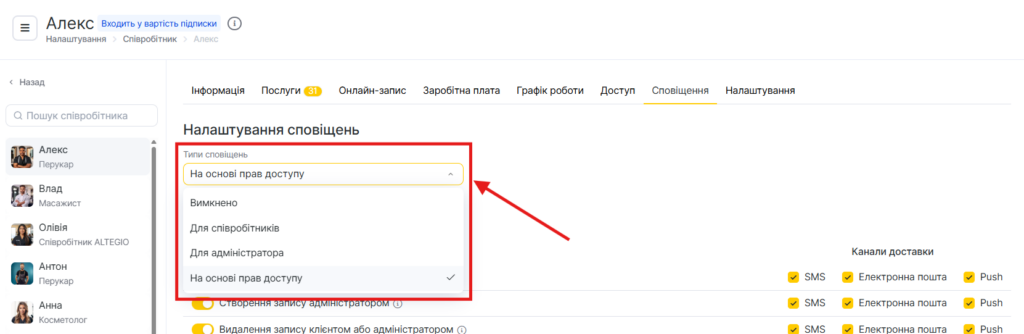 - На основі прав доступу — Altegio автоматично визначає тип сповіщень на основі прав доступу співробітника
