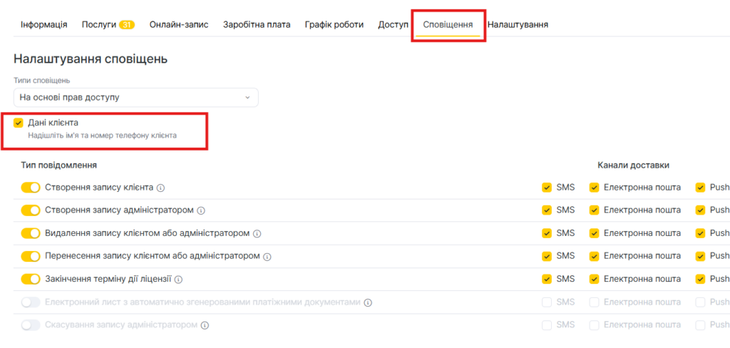 - Дані клієнта. Якщо зняти прапорець Надсилати ім’я та номер телефону клієнта, співробітник не отримуватиме контактні дані клієнта в SMS, Email і Push-сповіщеннях. При цьому він отримуватиме всі інші деталі запису, зокрема час і послугу.