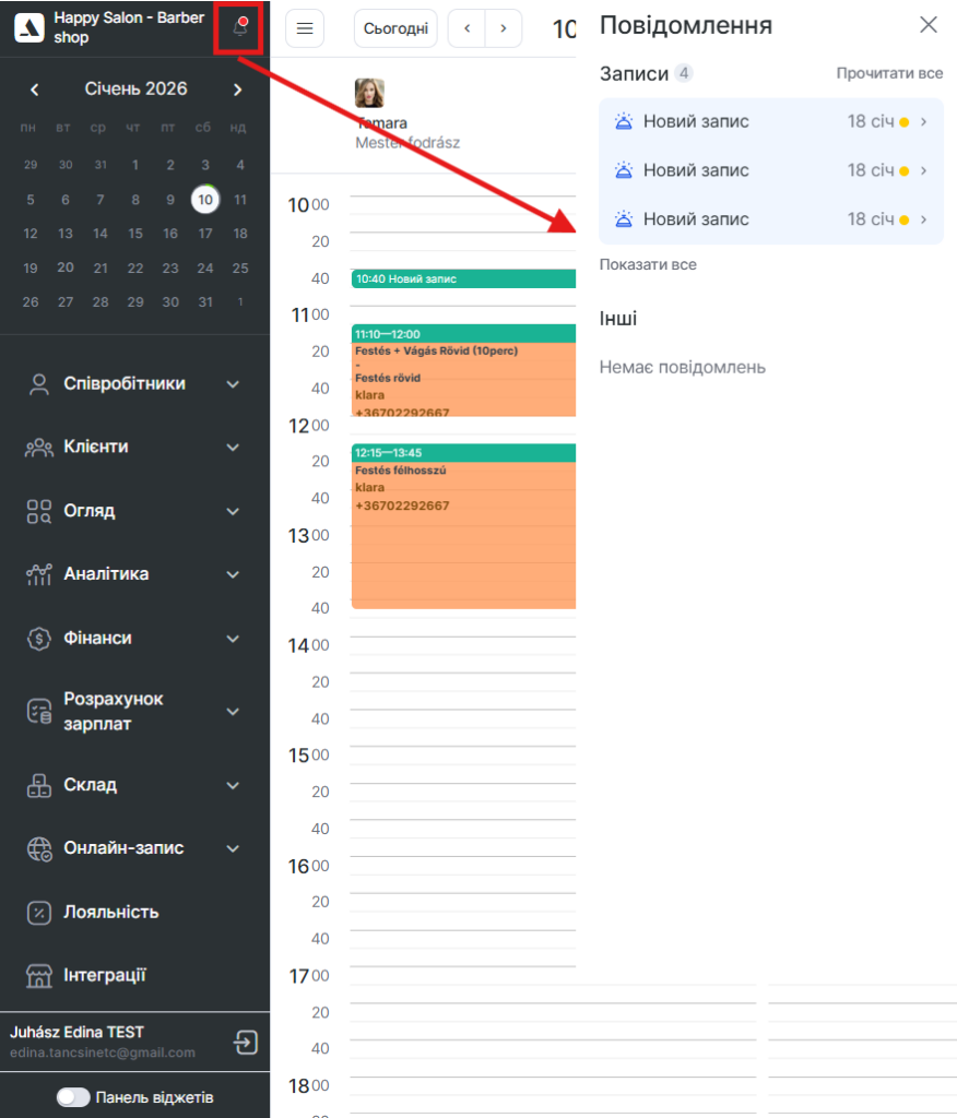 Усі такі сповіщення можна переглянути в центрі сповіщень, натиснувши на іконку дзвіночка на бічній панелі у верхньому лівому куті. - Операції із записами