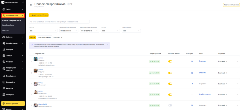- Перейдіть до Співробітники > Список співробітників (режим Адміністрація) виберіть потрібного співробітника та відкрийте вкладку Доступ.