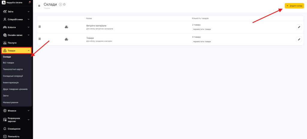 За замовчуванням в Altegio створено два склади: Матеріали та Товари. Склади можна додавати, налаштовувати та видаляти.