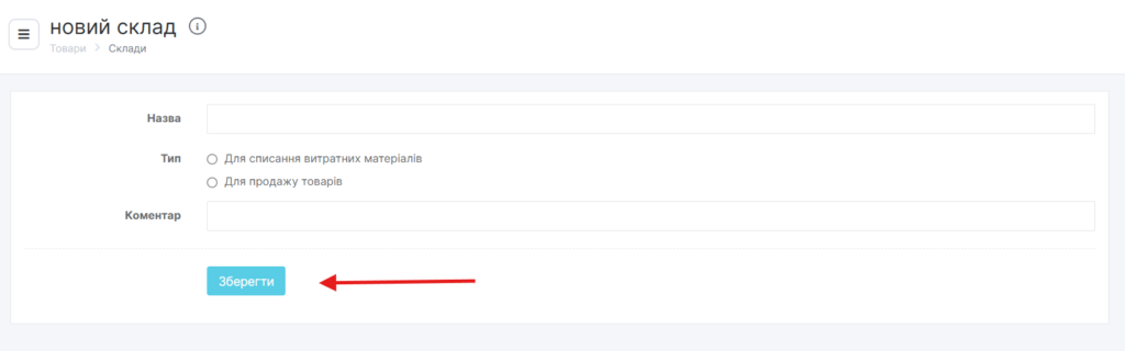 - У новому вікні вкажіть Назву, Тип складу (для списання витратних матеріалів або для продажу товарів) та Коментар.