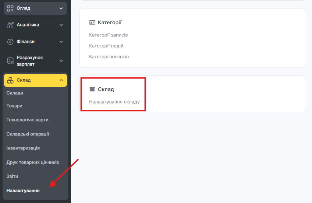 Перейдіть у розділ Склад > Налаштування > Налаштування складу.