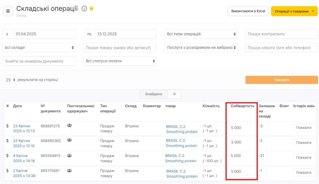 1. Під час перегляду операцій за складами розділ Склад > Складські операції.