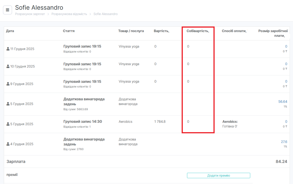 Якщо для співробітника налаштована схема розрахунку зарплати, яка повинна враховувати собівартість витратних матеріалів, то при розрахунку зарплати в розділі Розрахунок зарплат > Взаєморозрахунки відображатимуть собівартість витратних матеріалів.