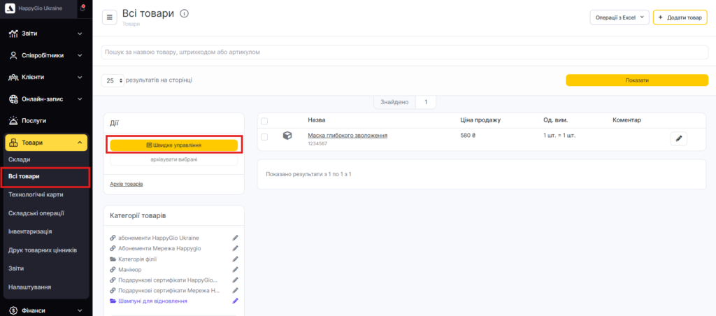 Для редагування інформації про товари в масовому порядку перейдіть до розділу Товари > Всі товари (режим Адміністрація) та натисніть кнопку Швидке управління.