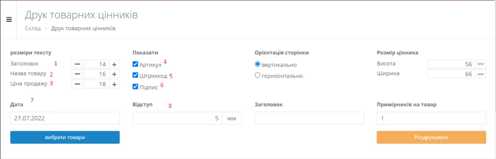 - Вкажіть дату друку цінника, налаштуйте розмір відступів, введіть текст заголовка та кількість екземплярів на товар.