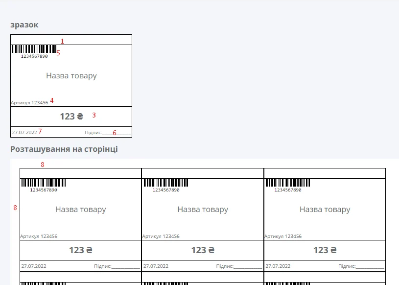 - Вкажіть, чи буде на ціннику відображатися артикул, штрихкод та підпис.