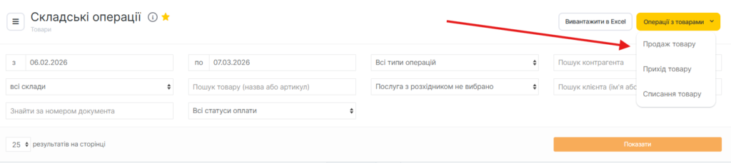 - У випадаючому списку виберіть пункт Продаж товару.