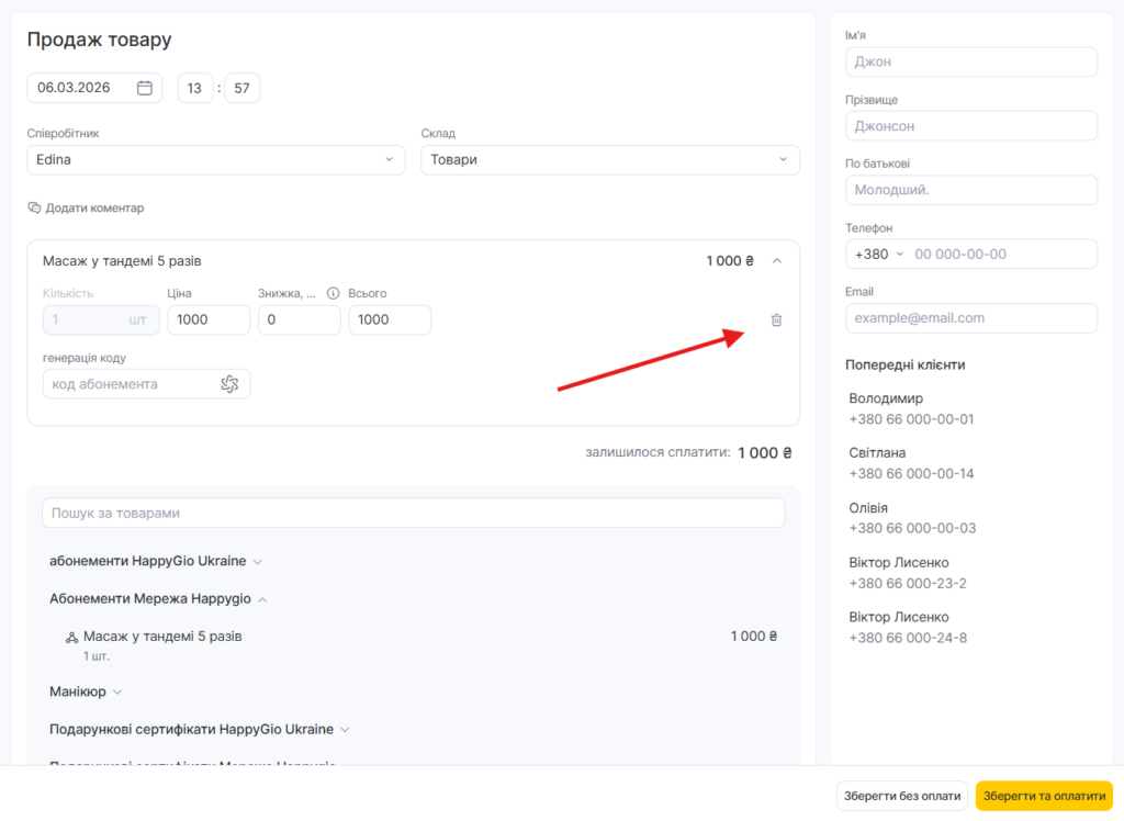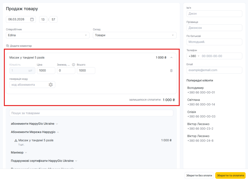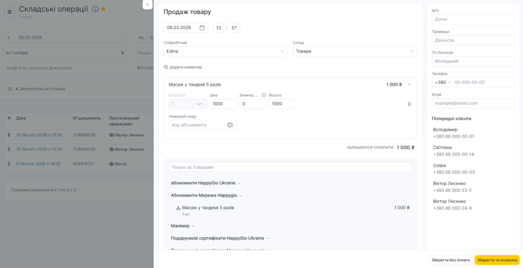 Якщо ви хочете оплатити операцію перед збереженням, натисніть кнопку Зберегти і оплатити. Ви можете здійснити оплату готівкою, банківською карткою або лояльністю.