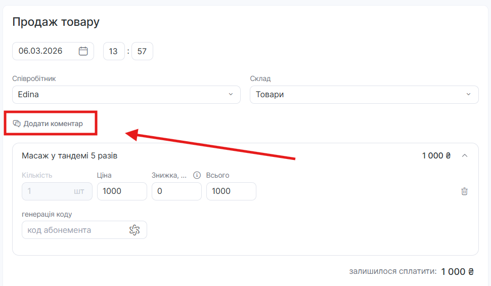 - Щоб додати коментар до продажу, натисніть кнопку Додати коментар.