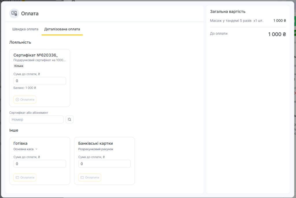 Після переходу до оплати (кнопка Зберегти і перейти до оплати) у блоці Деталізована оплата відобразиться лояльність, доступна цьому клієнту для оплати вибраних товарів. Щоб списати максимально можливу суму з балансу, просто натисніть на потрібний тип лояльності.