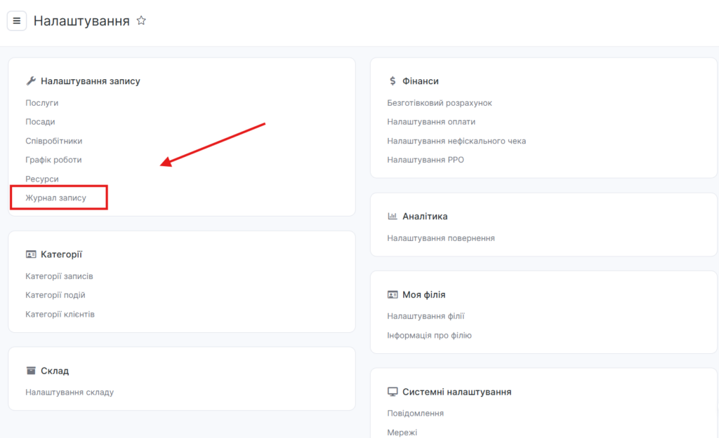 Журнал запису – основний інструмент адміністратора, в журналі можна переглянути картку клієнта, повну історію його відвідувань, побажання і статистику. Інтерфейс журналу можна налаштовувати, для цього перейдіть в розділ Налаштування > Налаштування запису >Журнал запису.