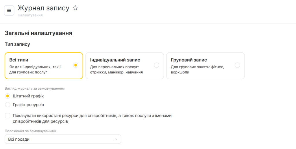 Якщо ви обрали графік співробітників, вкажіть, співробітники якої посади будуть відображатися за замовчуванням. Детальніше про налаштування посад читайте в статті Посади співробітників.