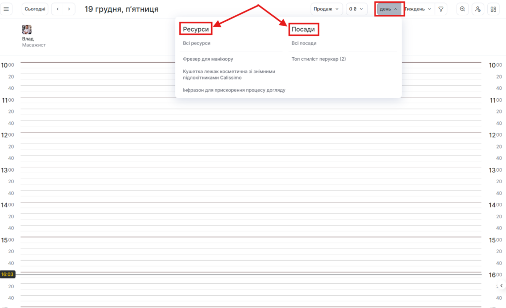 - У Графіку ресурсів — назва послуги та ім’я співробітника