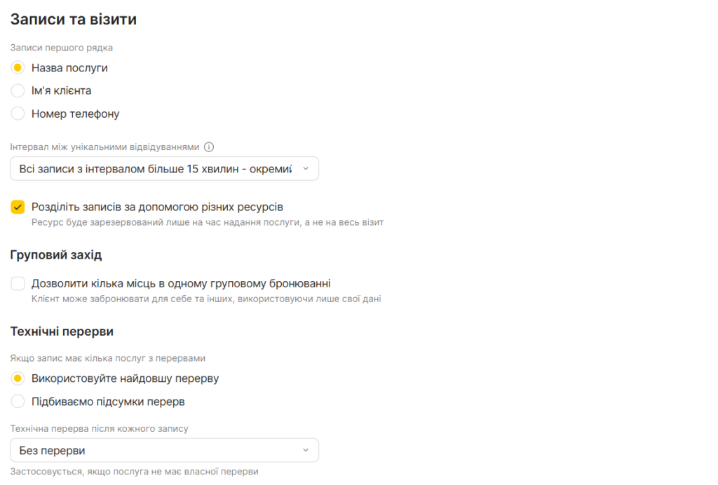 - Розділяти записи під час додавання послуг з різними ресурсами Під час створення запису на кілька послуг ресурси для кожної з послуг бронюються на весь час запису. Увімкніть цю опцію — тоді система буде створювати окремі записи для кожної послуги, щоб займати ресурси лише на час виконання відповідної послуги. Ця функція не працює для онлайн-запису, оскільки клієнт не може знати, в якому порядку йому будуть надані послуги.