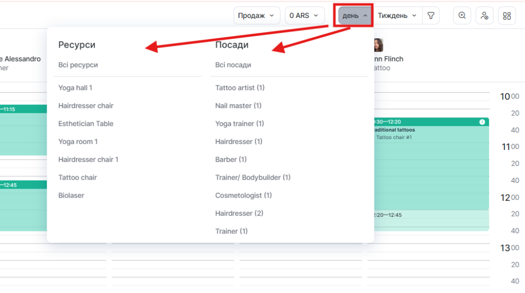 У режимі День можна переглядати розклад співробітників по всіх посадах або з якоїсь однієї, і так само по ресурсах.