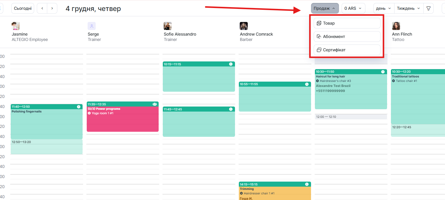 Там же, натиснувши Продаж, ви можете продати товар клієнту, навіть якщо у нього немає запису на вибраний день.