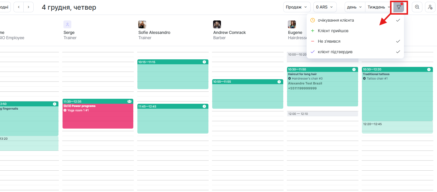 За допомогою кнопки фільтрації ви зможете відфільтрувати всі візити за їх статусами. Наприклад, можна приховати всі записи зі статусом “Не з’явився”, щоб вони не заважали створенню нових записів у журналі.