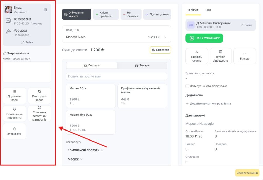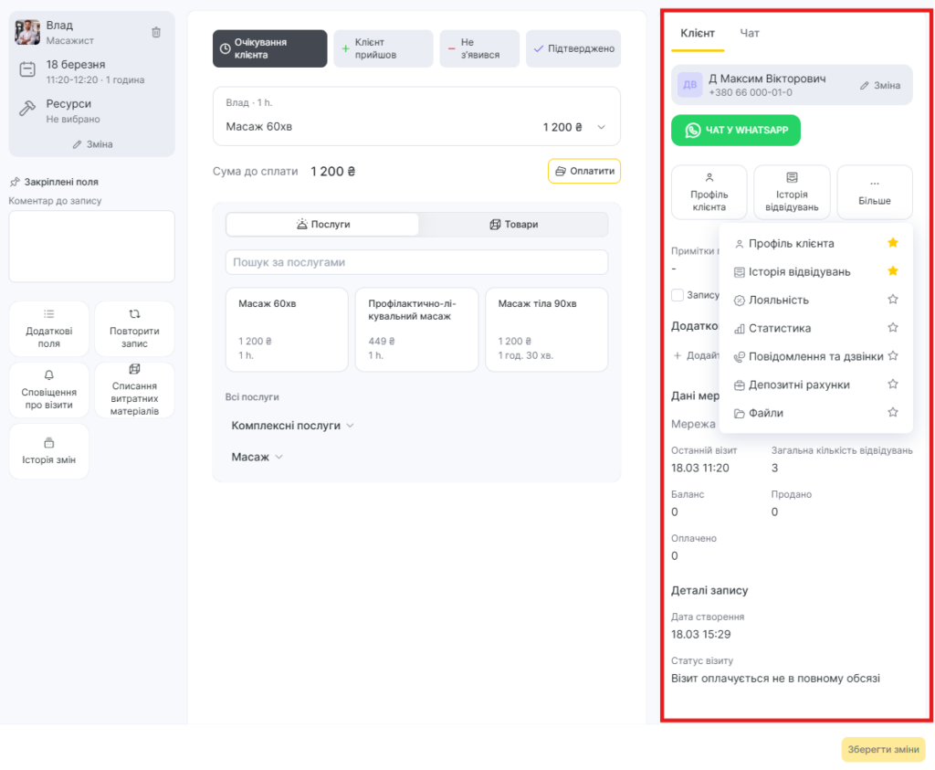 - Права частина відповідає за роботу з клієнтом: додавання клієнта до запису, перегляд даних клієнта та відвідувача, а також розділи Історія, Лояльність, Статистика, Повідомлення та дзвінки, Рахунки клієнта та Файли.