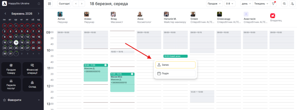 - Виберіть співробітника і час, на який потрібно записати клієнта. Натисніть на кнопку Новий запис, яка з’являється при наведенні на вільний час у журналі. Вкажіть вид запису Запис (Індивідуальний) або Подія (Груповий запис, докладніше про групові події можна прочитати тут).
