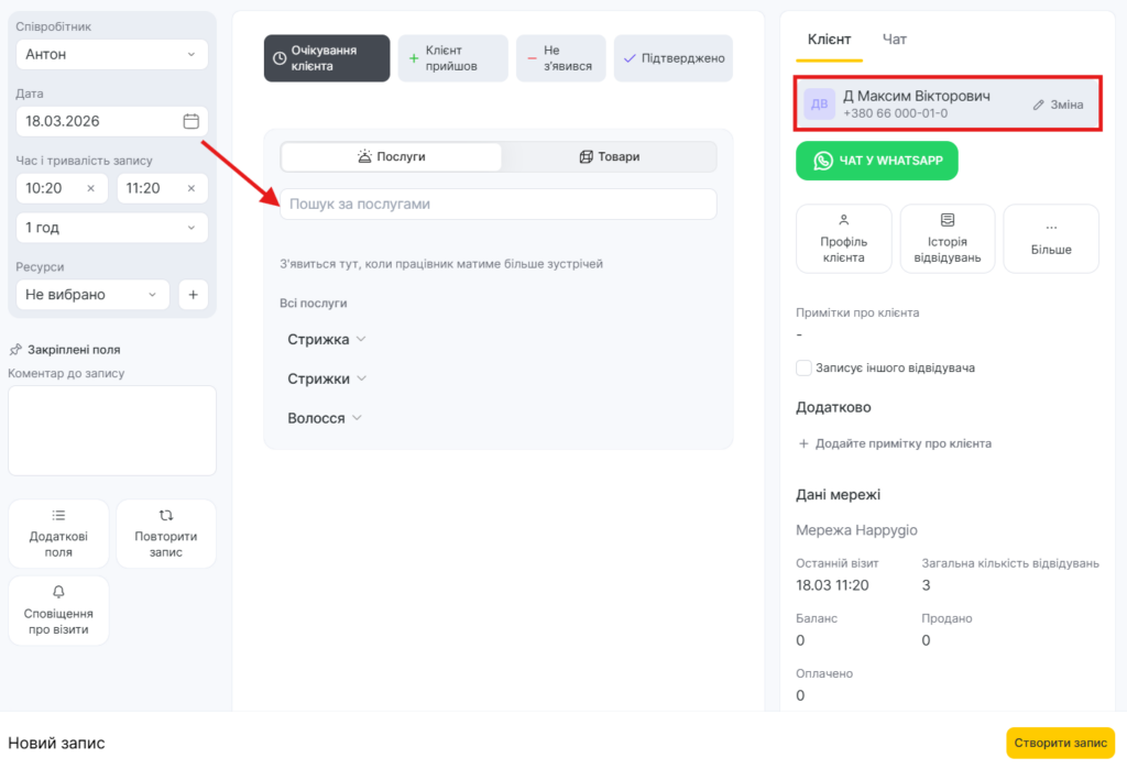 - Оберіть послугу та вкажіть ім’я і номер телефону клієнта — цього достатньо, щоб створити запис. Система автоматично підставить співробітника, дату й час, за потреби їх можна змінити. Після цього натисніть Зберегти запис. За потреби запис можна створити й без даних клієнта або послуги.