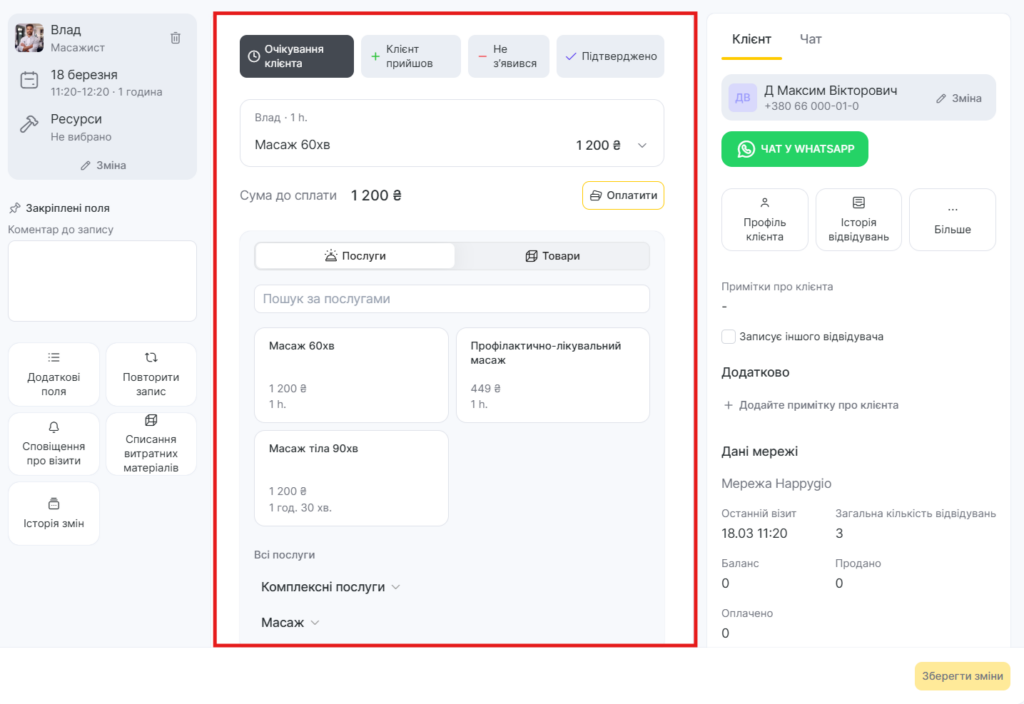 - Центральна частина — це робоча область запису: статуси візиту, послуги, товари та оплата.