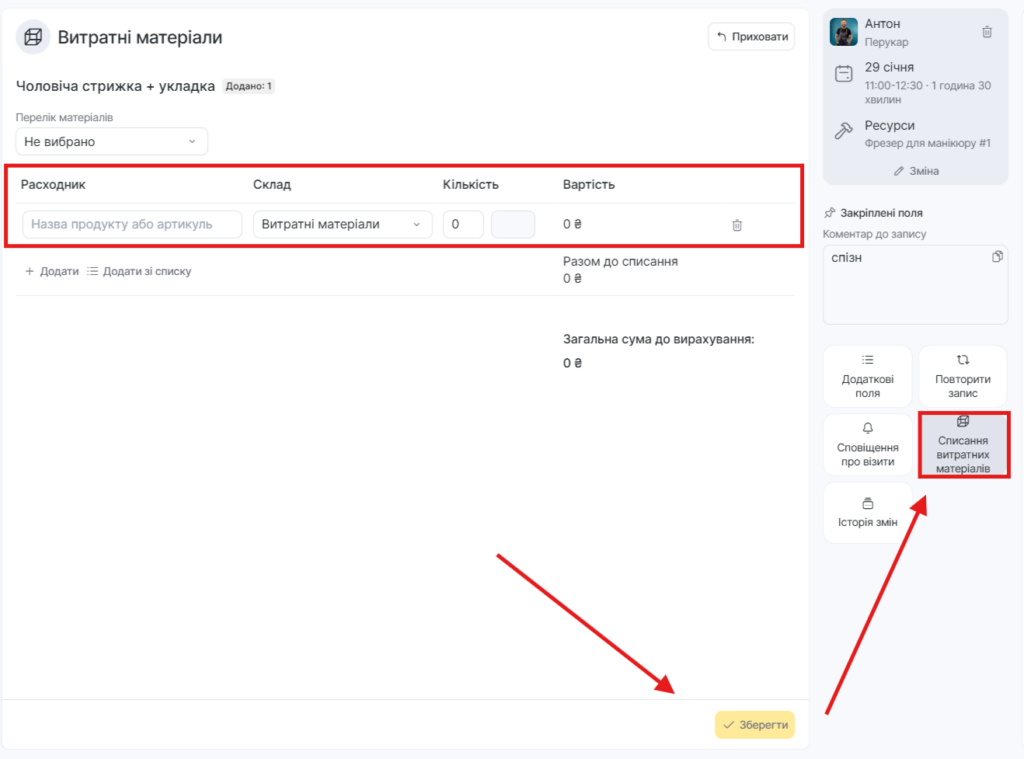 Якщо в записі зазначено кілька однакових послуг (наприклад, не «стрижка і манікюр», а дві стрижки), у блоці списання витратних матеріалів потрібно вказати кількість матеріалів для однієї послуги.